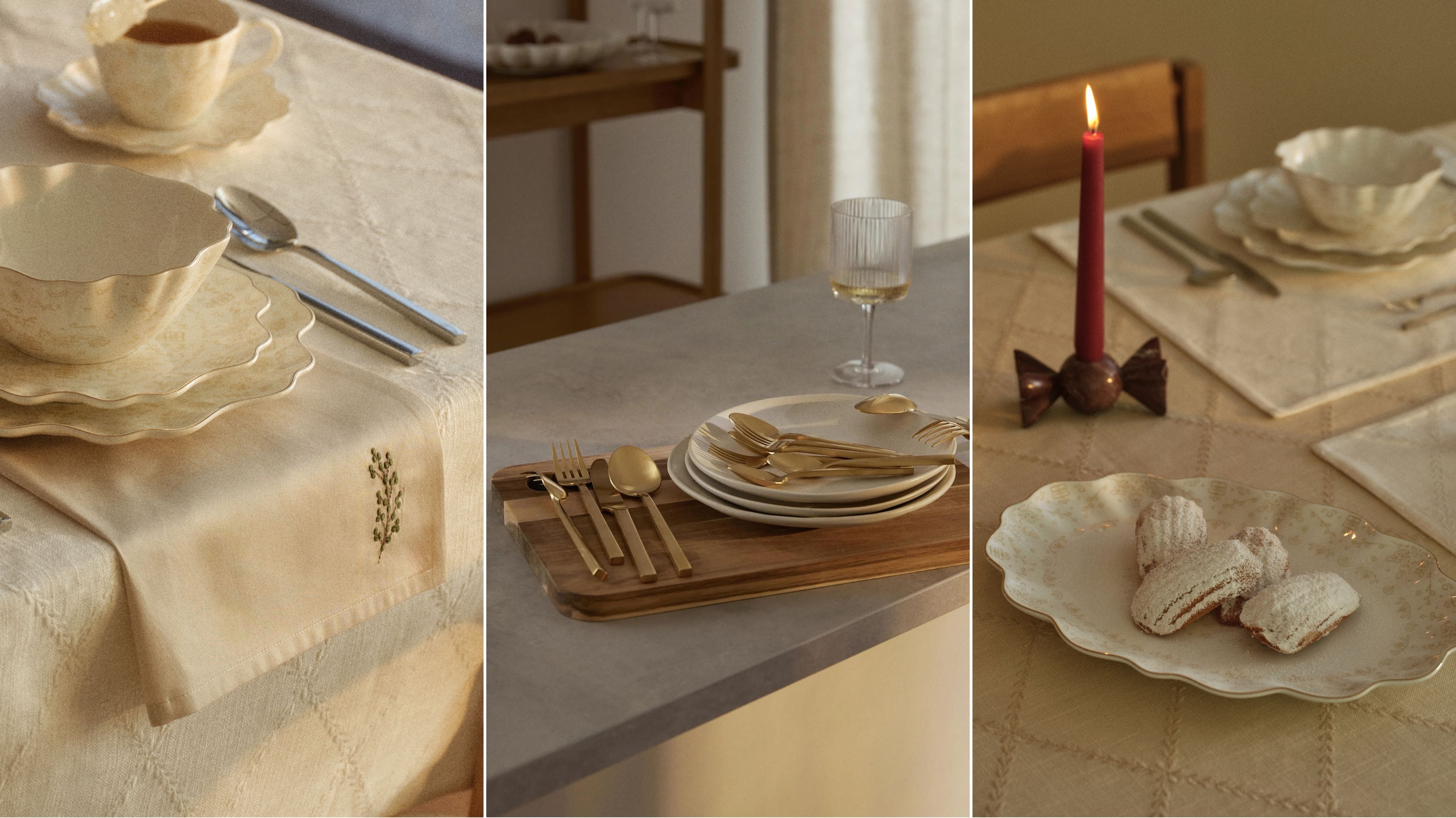 It’s beginning to feel festive: the Christmas plates can finally make their appearance. The LUMOS series, with its golden rim and delicate seasonal motifs in warm beige, is a modern classic. Paired with the embroidered TORY table runner and gold-toned cutlery, it creates a look that radiates pure Christmas magic.