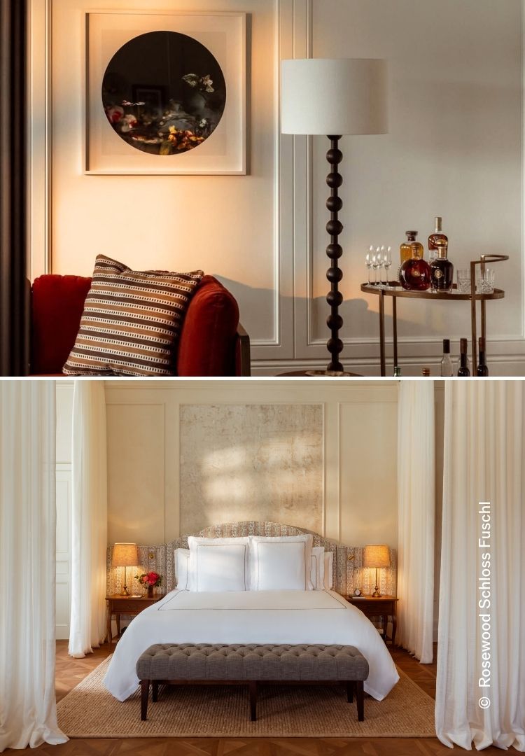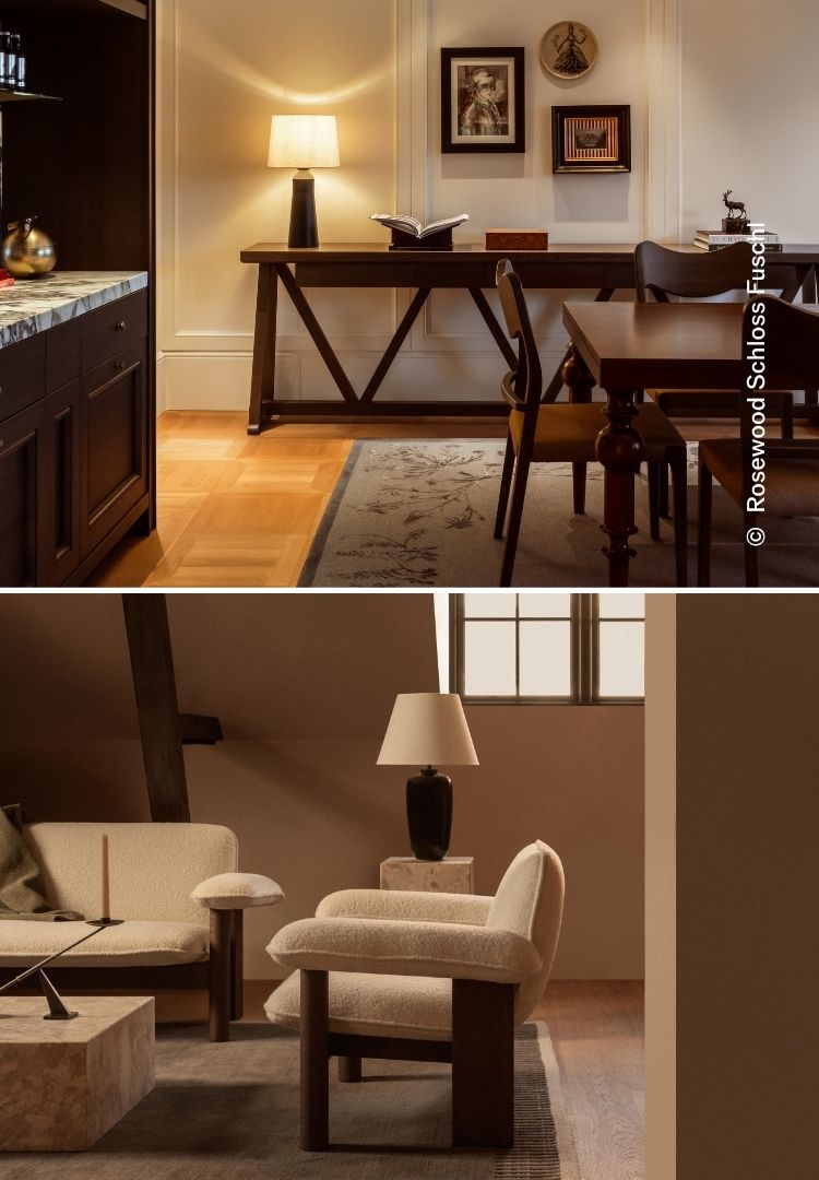 Towers and stone arches are reflected in the lake. Behind the walls, alpine materials, vintage details, and iconic design classics create a timelessly elegant setting in light-filled rooms.