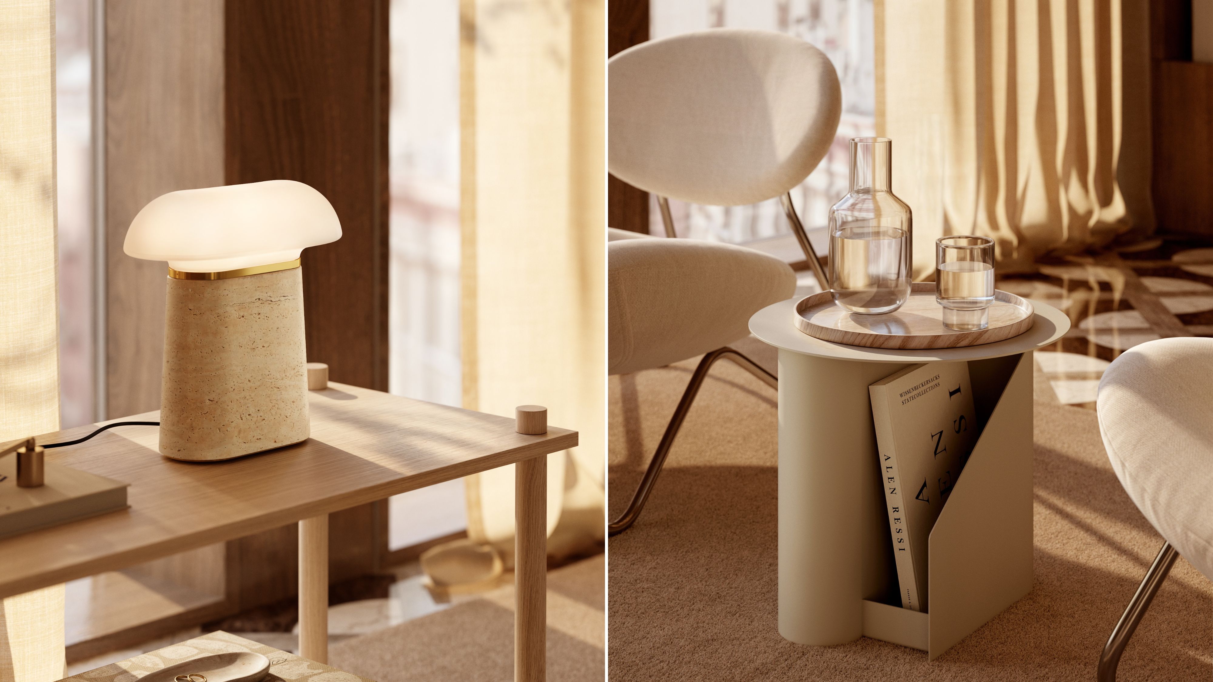 Designer-duo favourites: the NOVA table lamp and SENTRUM – side table and magazine holder in one – bring design and function into perfect harmony: sculptural, iconic and with a modern touch that adds character to the living room.