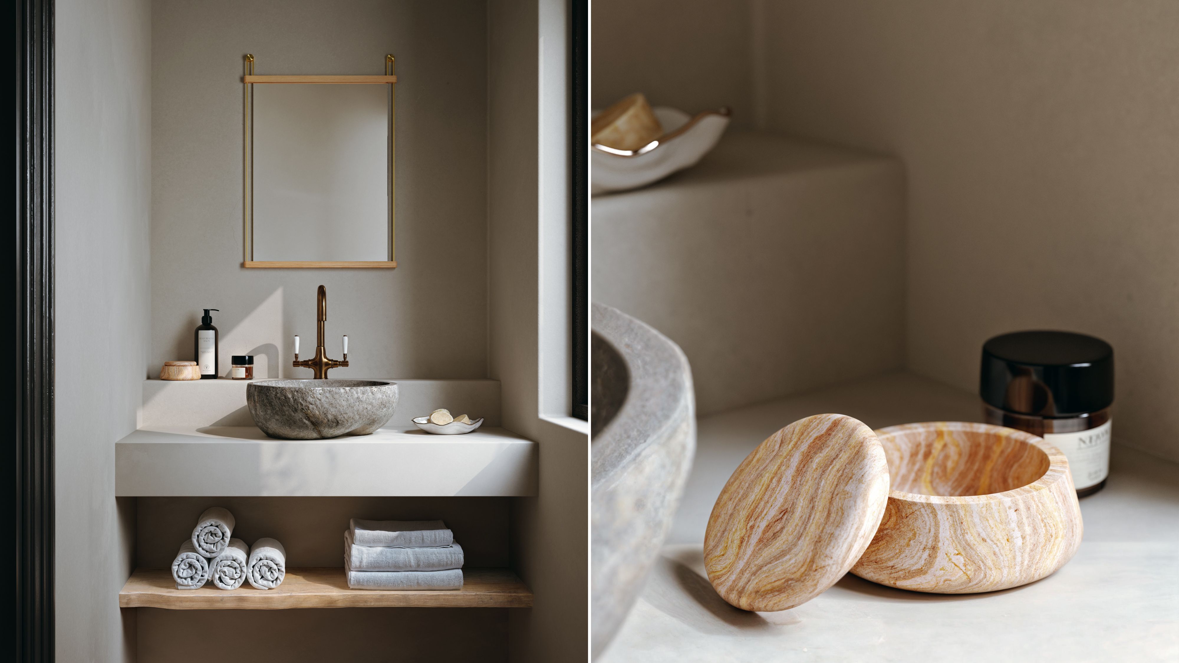 A refined mix of materials brings life into the bathroom: CRAIG combines FSC-certified wood and metal in a contemporary mirror, while accents in sandstone – such as the SERENE storage box – add a sense of calm and natural contrast.