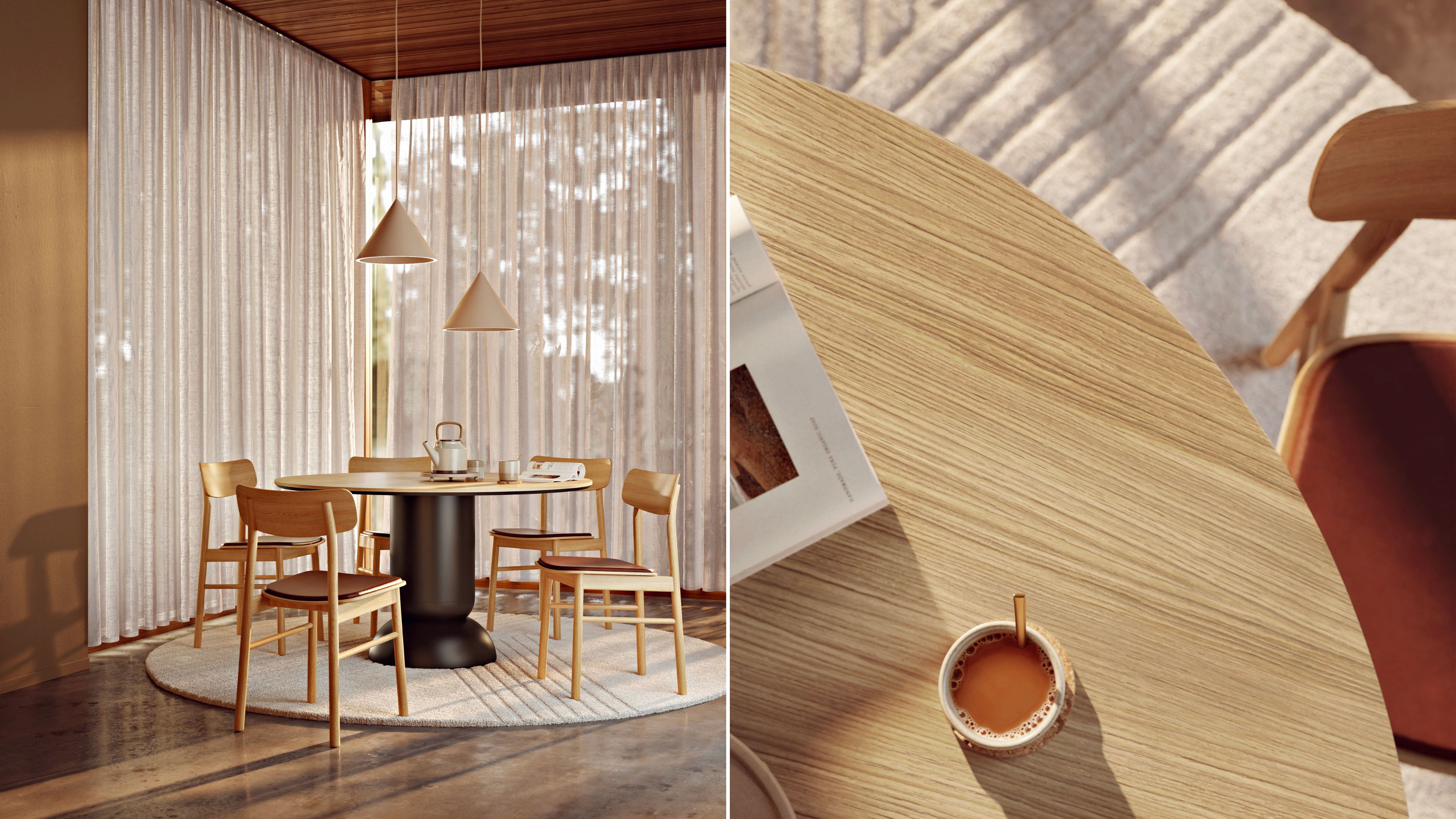 For shared moments at the table: ANNULAR bathes the room in soft light with its delicate LED ring, while the hand-tufted KYOTO rug echoes the mood with its gentle texture – for a look that feels modern yet serene.